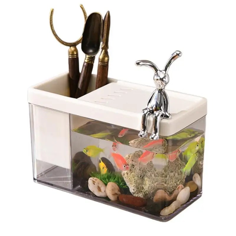 2.Practical Space-Saving Solution: Designed for small works, this compact fish tank doubles as a versatile desktop organizer boasting a pen holder, delivering the perfect blend of practicality and aesthetic appeal.